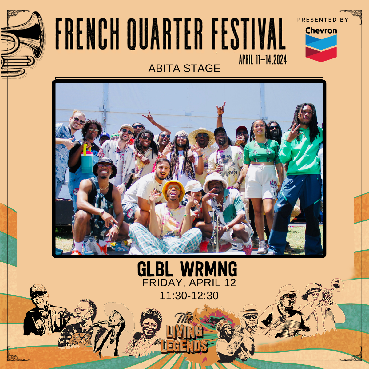 glbl wrmng make their French Quarter Fest debut on the Abita Main Stage. More info on the fest here .